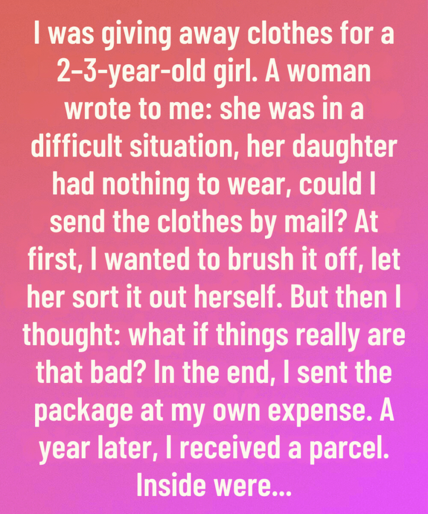 I was giving away some clothes for a little girl, about two or three years old. A woman wrote to me: she was in a difficult situation, her daughter had nothing to wear, and asked if I could send her something by mail.