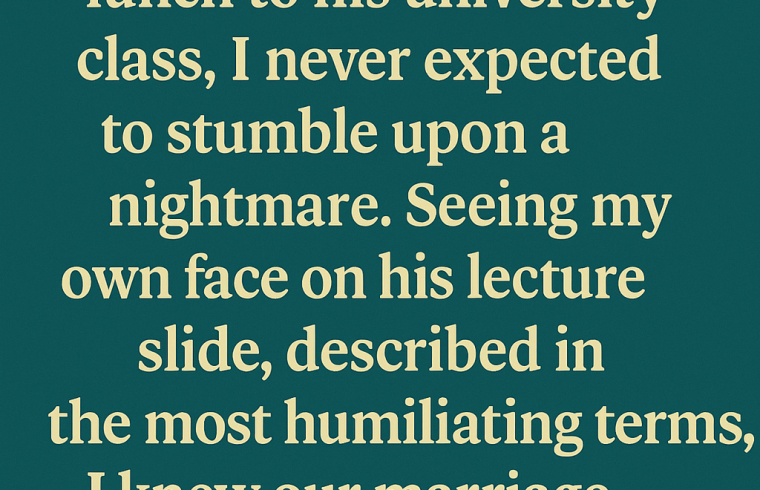 When I decided to surprise my husband by delivering his forgotten lunch to his university class, I never expected to stumble upon a nightmare. Seeing my own face on his lecture slide, described in the most humiliating terms, I knew our marriage would never be the same.