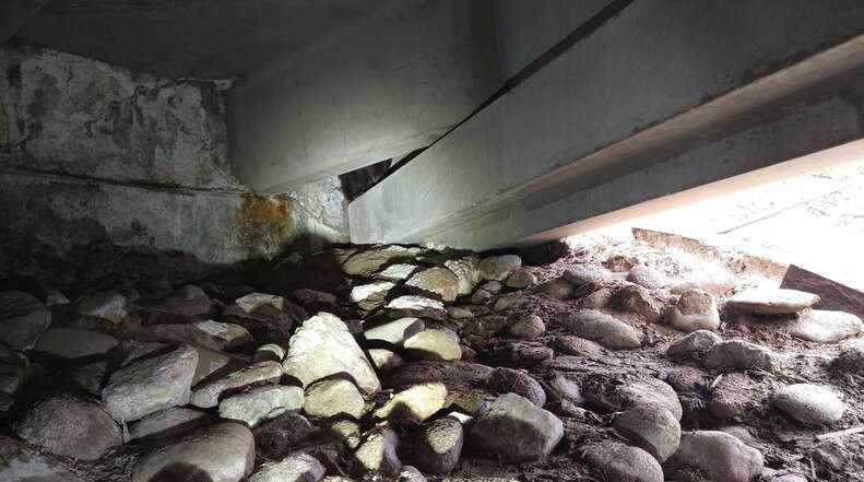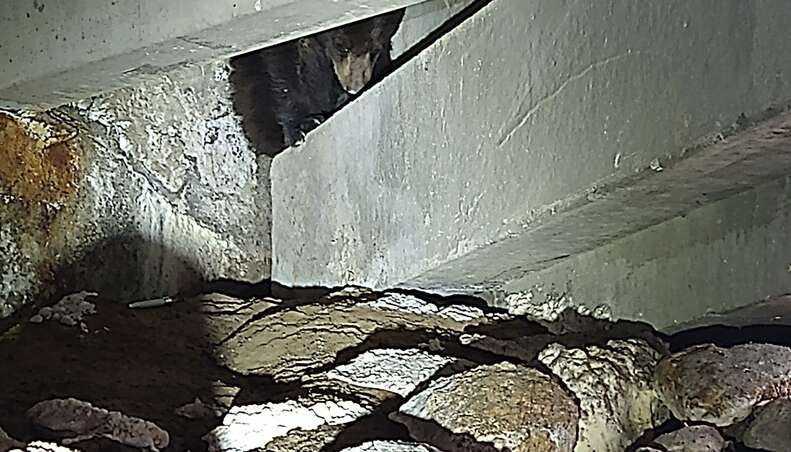 When Aaron Berscheid, a district wildlife manager for CPW’s Southeast Region, arrived at the scene, he didn’t see the bear at first. After searching around for a bit, he caught a glimpse of a little furry face peeking out from a hole in the concrete.
