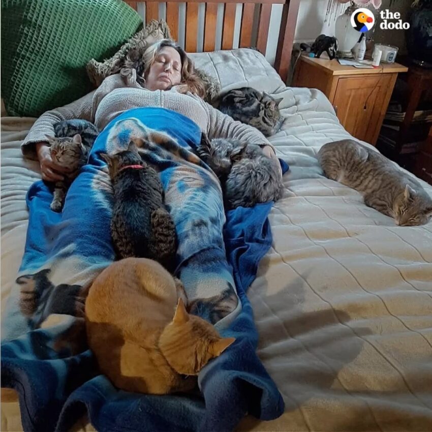 One by one, each cat cuddled up with Mom until all five of them were surrounding her, trying to make her feel better the only way they knew how.