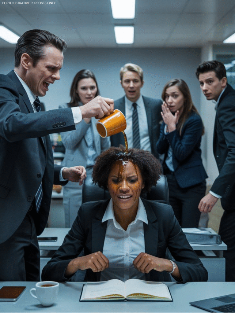 The break room froze. Colleagues stared, some covering their mouths, others too stunned to speak. Monique trembled, her chest burning from humiliation more than the heat. With her back straight and her eyes glistening, she turned and walked out without a word.
