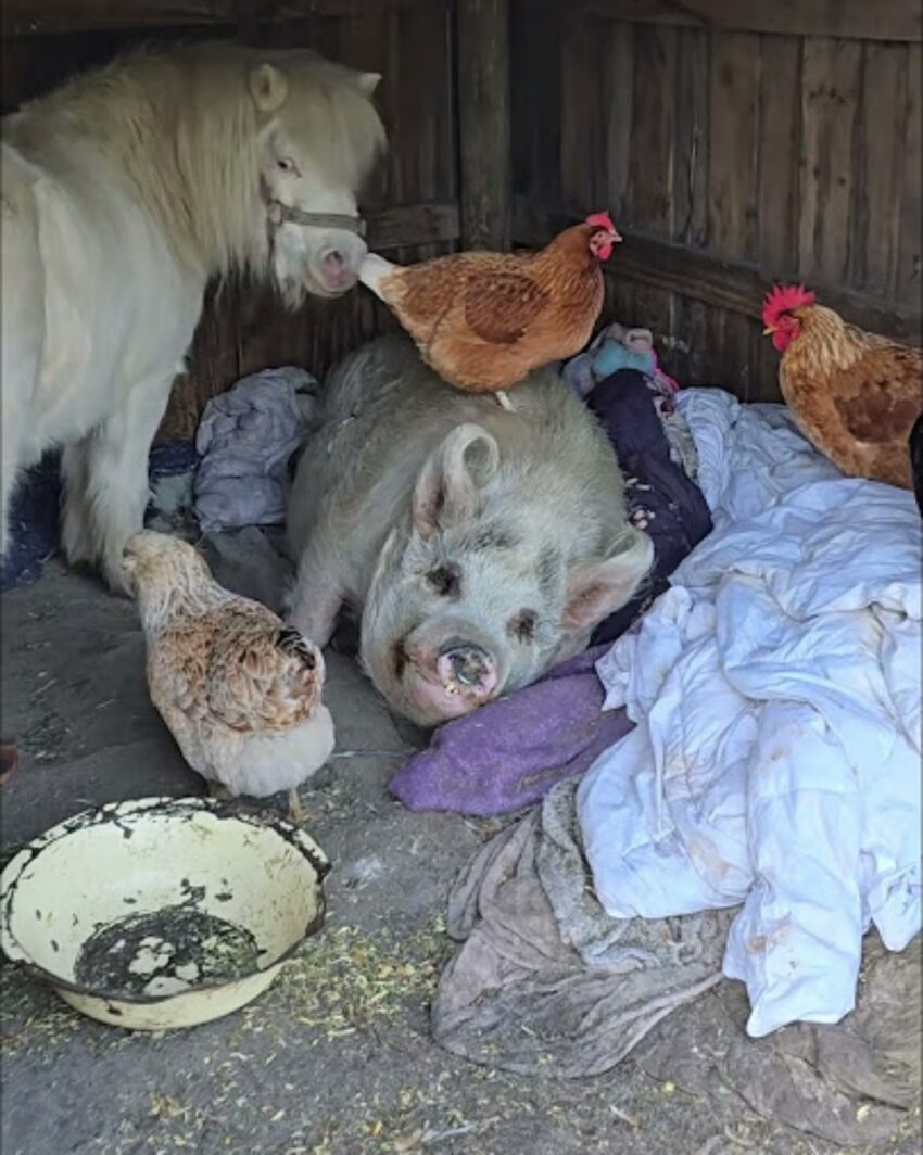 By morning, Tom discovered the scene: the frightened pig no longer alone, but surrounded by a silent circle of comfort and support. She had not moved from her spot entirely, but she had stopped trembling. She sniffed at the goats, nudged a chicken, and allowed Jasper to nuzzle her gently. In that moment, Tom realized something profound: healing often comes not from words or force, but from presence and patience.