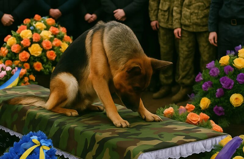 But suddenly that silence was pierced by a long, sorrowful bark. People turned around. Slowly, a German shepherd emerged from the crowd – the officer’s faithful friend. He walked slowly, heavily. The dog stopped at the coffin, looked at it, and with his last strength leapt onto the lid.