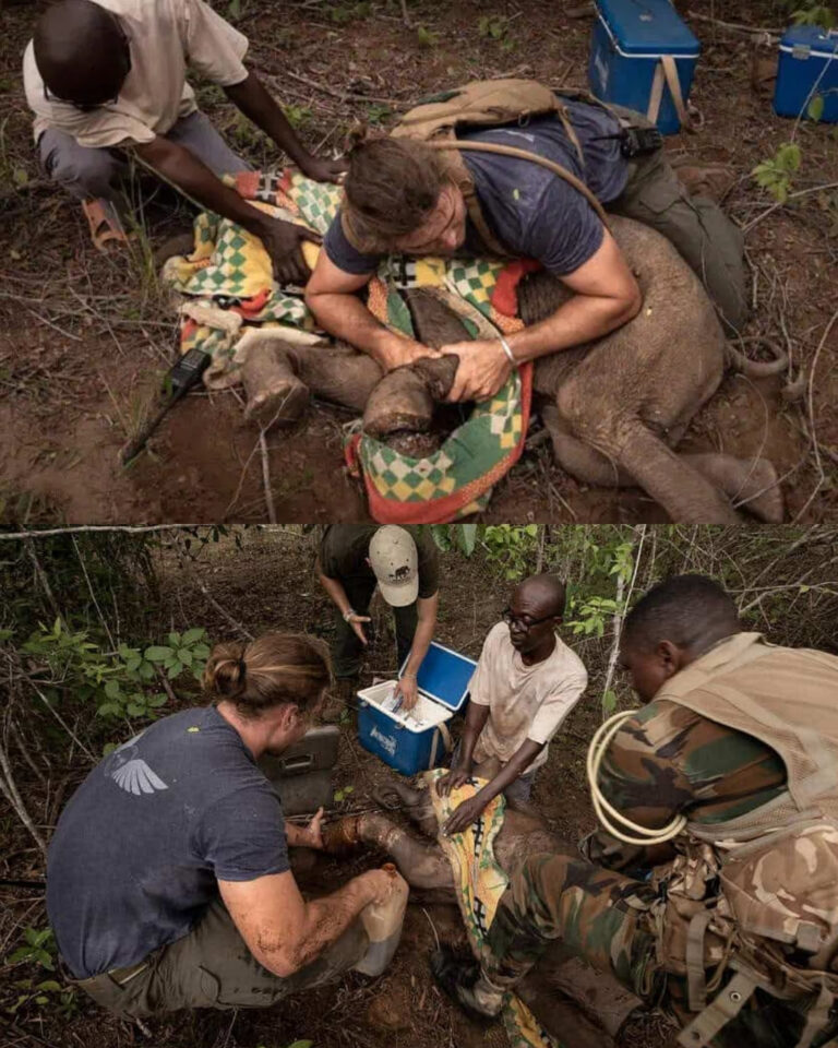 She refused to leave her calf’s side — anxious, defensive, ready to fight to protect her baby. From above, the pilot guided her gently into a nearby clearing, where Dr. Poghon administered a tranquilizer dart.