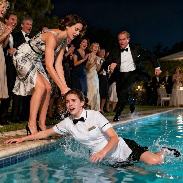 A poor waitress was pushed into the pool while everyone laughed at her — then a millionaire walked in and did something that left everyone speechless…..