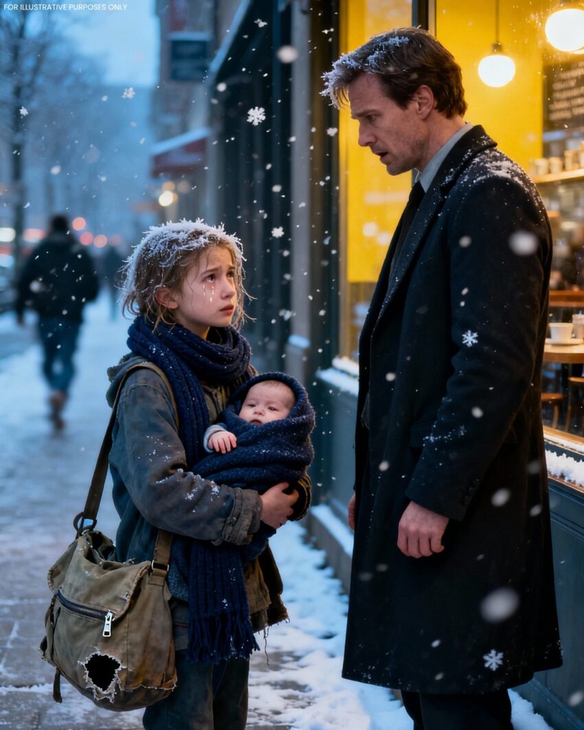 He turned. A girl stood near the curb, her hair tangled by the cold, her coat several sizes too big. In her arms she carried a small bundle, wrapped in a blanket so thin it barely held together. “My brother’s hungry,” she said softly. “Just one box of milk. I’ll pay you back when I grow up.”