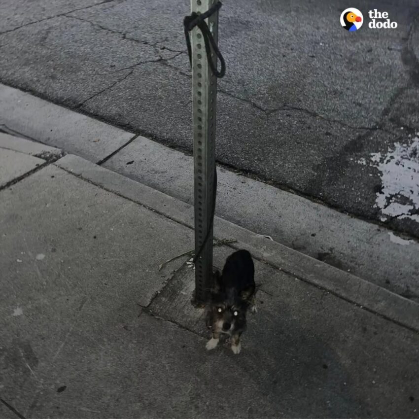 A pack of coyotes roamed the neighborhood that night, but the little pup managed to fend for himself when they appeared. Despite his short stature and the disadvantage of being tethered to a pole, the sweet boy survived the night.