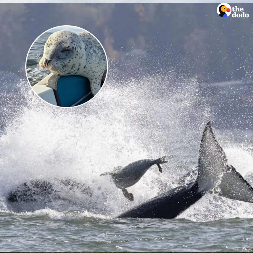 Suddenly, the splashing stopped. The orcas seemed to grow tired of the chase and began closing in on the seal. And that’s when the little animal beelined toward the photographers’ boat, jumping aboard just in time.