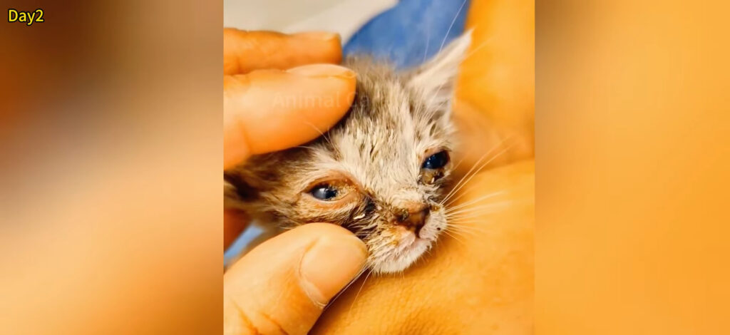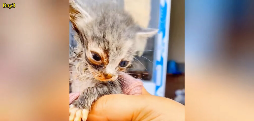 At home, I prepared warm milk, which she eagerly gulped down, clearly starving. Cleaning her tiny body, I noticed her closed eye infested with insects.