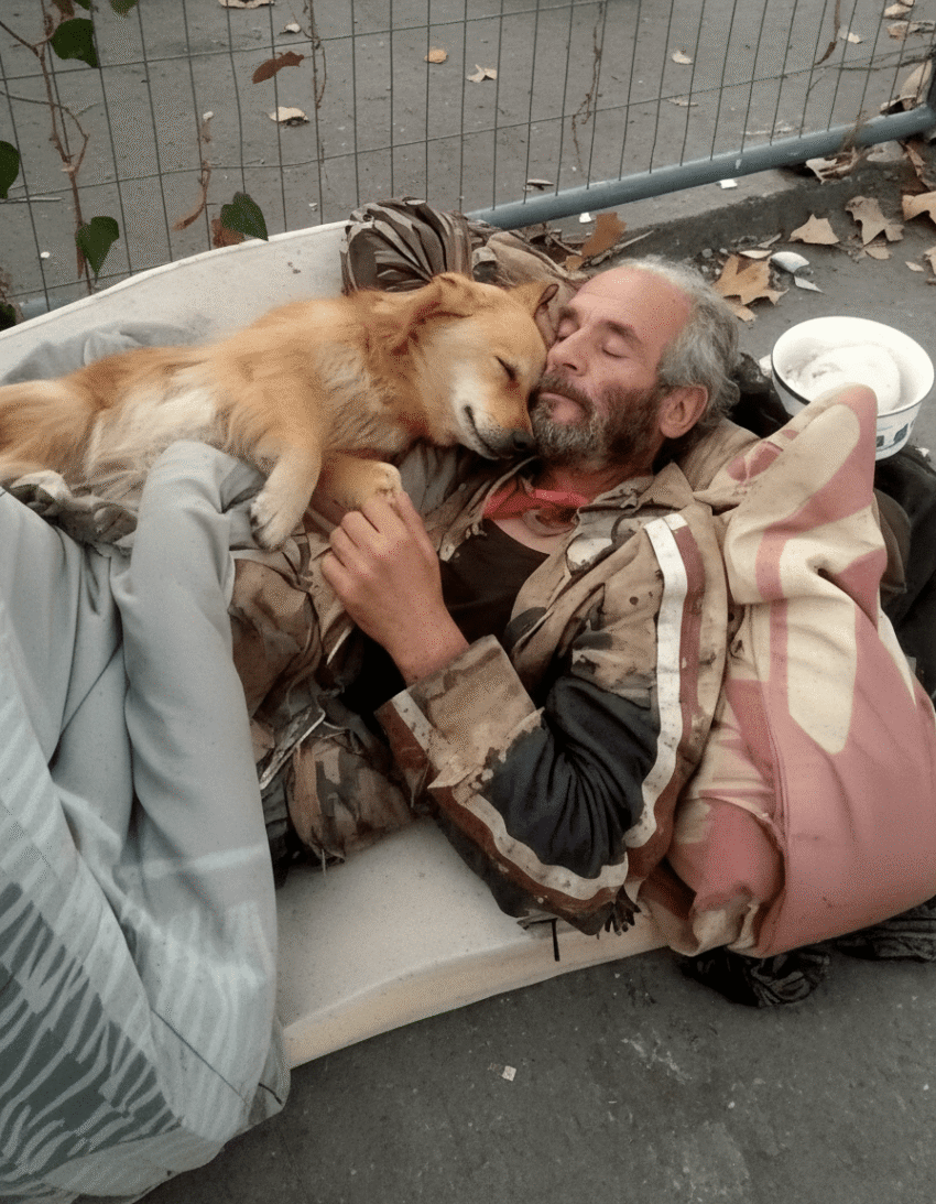 In the biting winter of 2019, the streets of Portland, Oregon, were glazed with ice and indifference. Among the hurried footsteps and steaming coffee cups carried by people rushing to warmth, one man had stopped moving forward months earlier. James Whitaker (everyone called him Whit) once installed solar panels on rooftops, earned enough to take his daughter to the Saturday farmers’ market, and kept a tidy apartment with framed photos of better days. A sudden layoff, spiraling medical bills for a heart condition, and eviction notices arrived faster than help ever did. By December he was sleeping against the brick wall of a shuttered bookstore, wrapped in a salvaged moving blanket that smelled of mildew and lost dreams. That was when a small golden dog with frost on her whiskers decided he belonged to her.