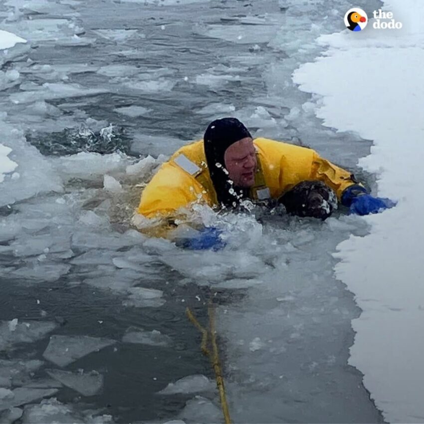 Clad in rescue gear, Vandenheuvel navigated the icy lake and wrapped the pup in his arms. Then, using a rope, rescuers on land pulled Vandenheuvel and Hazel back to shore.