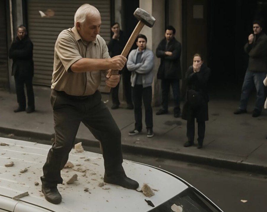 People froze in astonishment — and the horror in their eyes grew with every blow. The metal beneath his feet bent and cracked; the roof was already covered with deep dents, pieces of paint and metal scattering onto the asphalt. The van’s windshield, recently intact, was now cracked, and with the next blow of the sledgehammer it shattered into tiny fragments. Each swing was accompanied by clanging, dull thuds, and echoes spreading through the street.