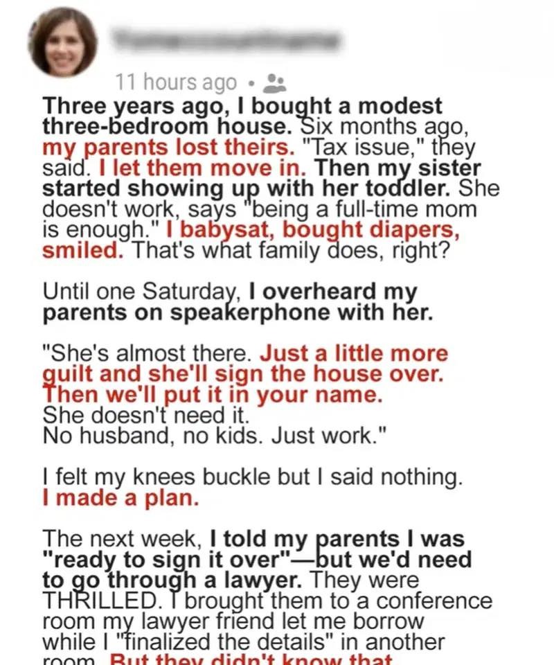 The conversation she witnessed was a planning session between her parents and sister Claire, focused on developing a strategy to manipulate Sarah into signing over ownership of her home. This was not a casual discussion or a moment of weakness, but a calculated conspiracy designed to exploit her emotional attachment to family and her history of sacrificing her own interests for their benefit.