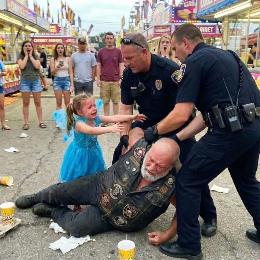 My daughter’s scream cut through the noise of the county fair like a siren, sharp enough to stop every heartbeat in its path. “That’s my grandpa!” she cried, her tiny fists pounding against the arms of the police officers who were pinning my father to the ground. A five-year-old in a pink fairy dress fighting grown men because someone decided a leather vest and long gray hair were signs of a criminal. It was a moment that would fracture our family’s sense of safety, expose the cruelty of assumptions, and reveal the fierce loyalty between a grandfather and the little girl who adores him.