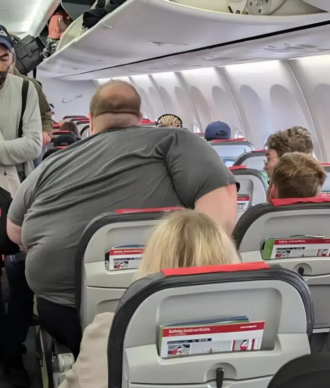 He boarded calmly, in a grey T-shirt, looking composed. He took his seat by the aisle. But quickly, eyes turned to him: his frame slightly overflowed into the middle seat, blocking the passage.