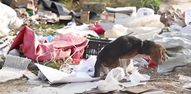 In the midst of a desolate landfill, filled with refuse and debris, a stray dog lay on the edge of collapse. His fragile body, battered and weakened by starvation, had lost the will to fight. His ribs were starkly visible beneath his thin, matted coat, and his eyes were dull, reflecting the depth of his suffering. The world around him had become a hopeless expanse, and he seemed to have given up.