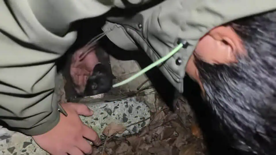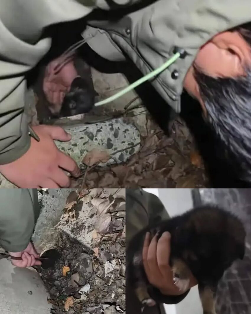 It was a cold, quiet night when a man walking home heard something that stopped him in his tracks—a faint, desperate cry. It was the kind of sound that immediately tugs at the heart, a noise so urgent it demanded action. Following the sound, he discovered the source: a tiny puppy trapped in a sewer pipe, partially buried under dirt. Without hesitation, he knew he had no time to waste.