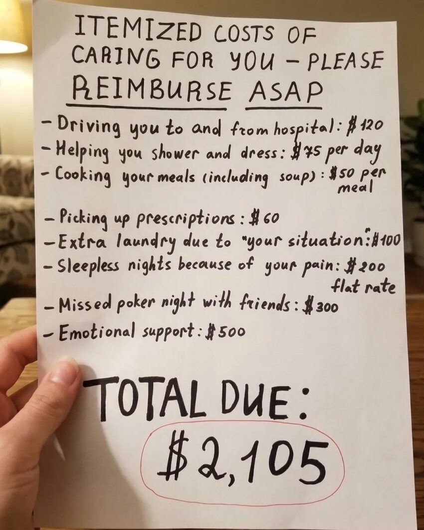 Three days after I returned home from major surgery, still weak and moving carefully through the house, I noticed a piece of paper taped to our refrigerator. At first, I assumed it was a reminder or a grocery list. Instead, it was an itemized note detailing the “costs” my husband believed he had accumulated while helping me recover. Each task—driving me to appointments, preparing meals, taking time off work—had a dollar amount next to it. Until that moment, I believed our seven-year marriage was built on quiet devotion and mutual care. We lived simply, shared responsibilities, and rarely argued. Seeing my vulnerability reduced to numbers shattered the calm image I had trusted for years.