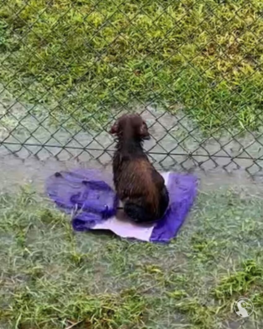 When the rescue team arrived, they couldn’t find the puppy anywhere — it was difficult to see in the heavy rain. But after a thorough search, one of the rescuers finally spotted him sitting perfectly still on an old onion sack.