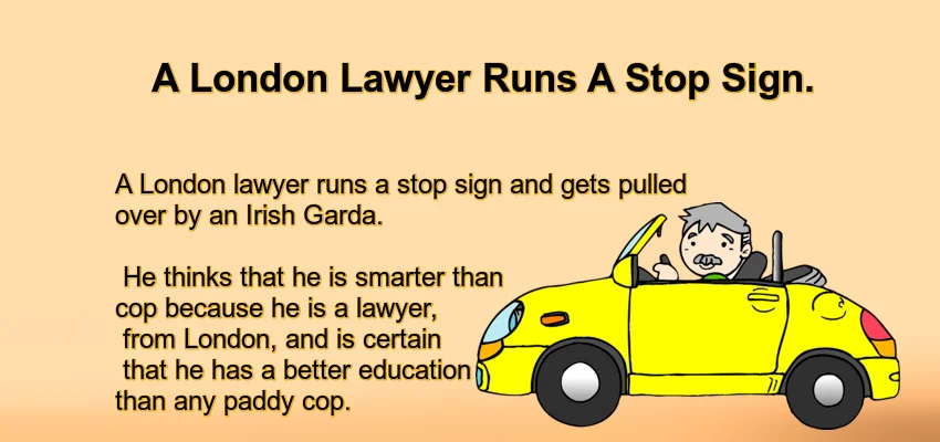 A London lawyer runs a stop sign and gets pulled over by an Irish Garda. He thinks that he is smarter than the cop because he is a lawyer, from London, and is certain that he has a better education than any paddy cop.