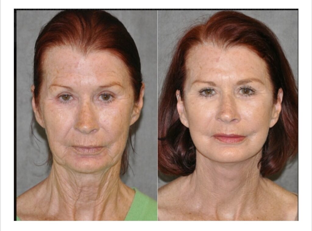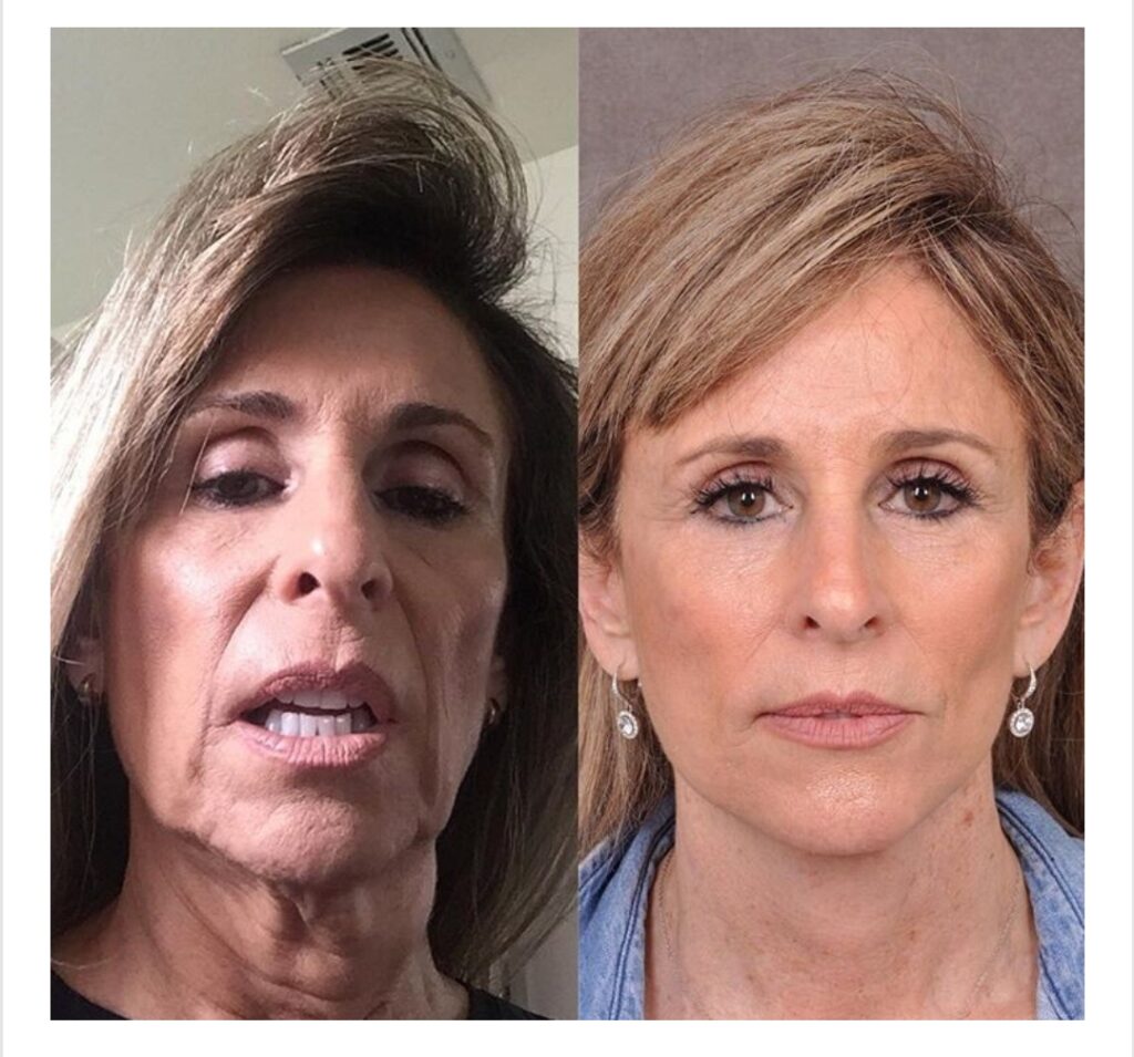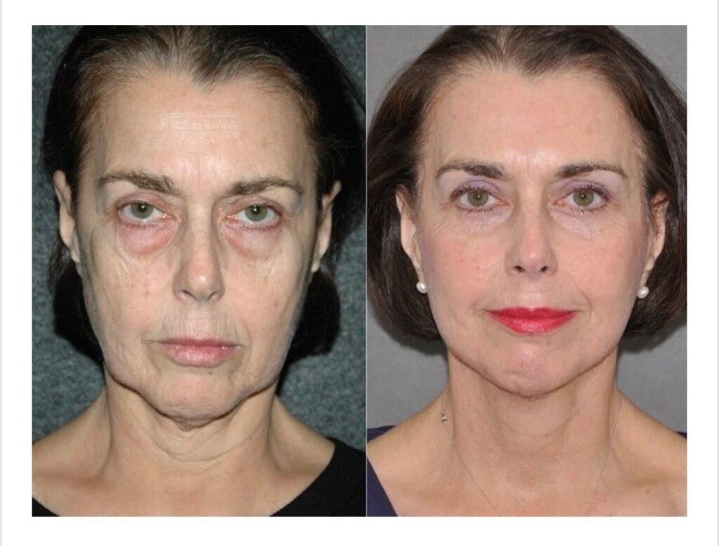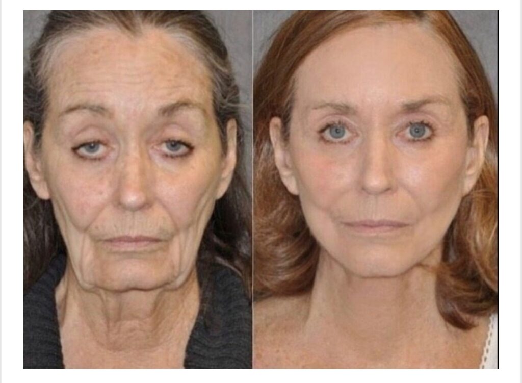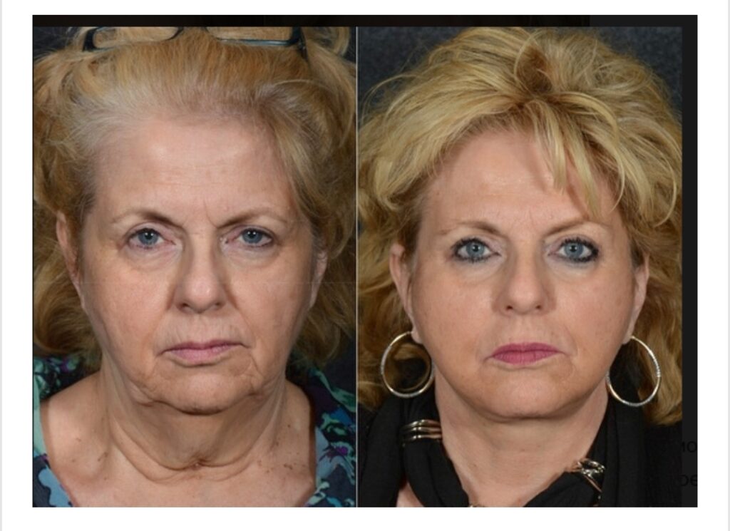 A stunning facelift result for a 65-year-old woman. Even despite the clear presence of makeup after the surgery, the miraculous transformation is undeniable. On the left, we see a woman with saggy, wrinkled skin and pronounced bags under her eyes. Furthermore, the woman had previously undergone unsuccessful facial liposuction which deformed the tissues. The doctor lifted the tissues of the face and neck, eliminated the bags, and all this was done under local anesthesia! According to him, the result of the surgery can last up to 10 years.