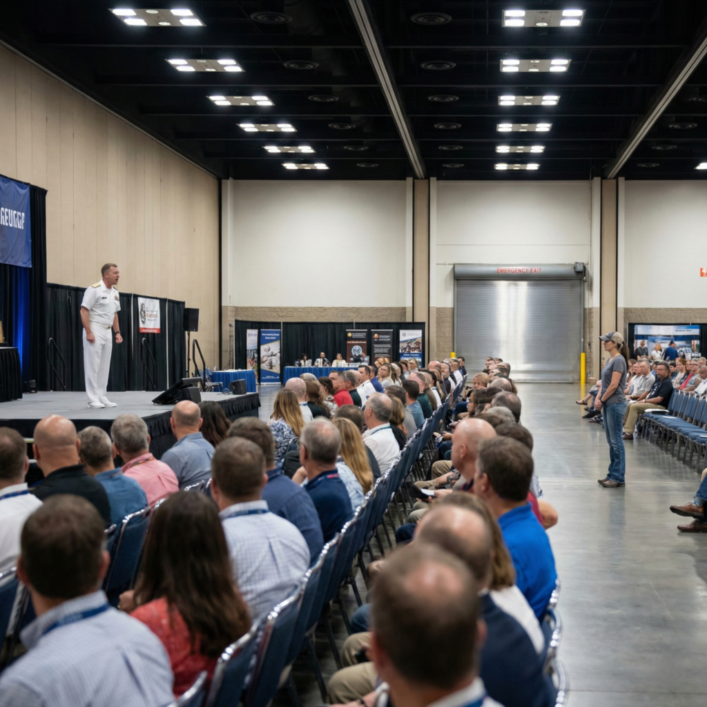 She didn’t wait for him to respond. She stepped toward the edge of the stage, the wooden boards groaning under her sneakers like a hull under pressure. The General in the front row was standing now, his face a mask of disciplined fury. He wasn’t clapping. He was signaling. Two men in charcoal polos—security, or perhaps something more clinical—started moving toward the stairs from the left flank.