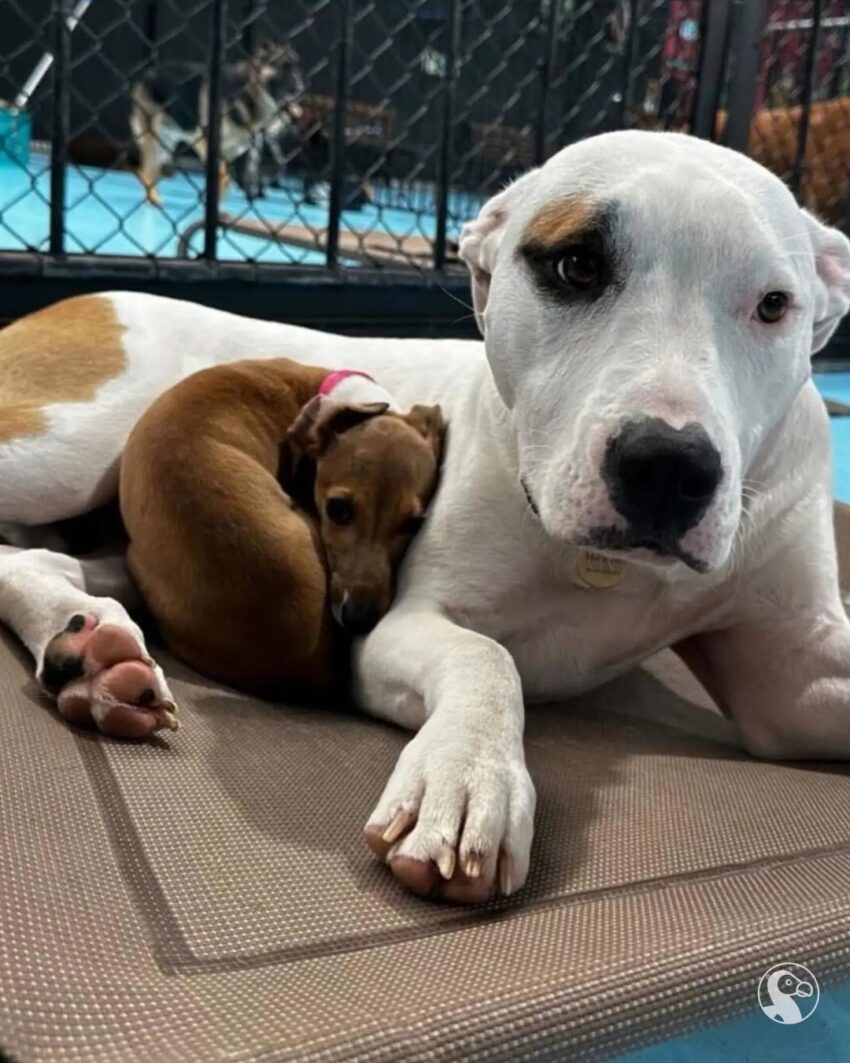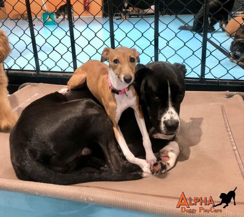 But Magyar was surprised when, a week into the pup’s stint at Alpha Doggy PlayCare, she received a photo update from the staff. Iris had decided that instead of sleeping on the beds or the floor, the comfiest place for a nap was curled on top of a big, fluffy dog.