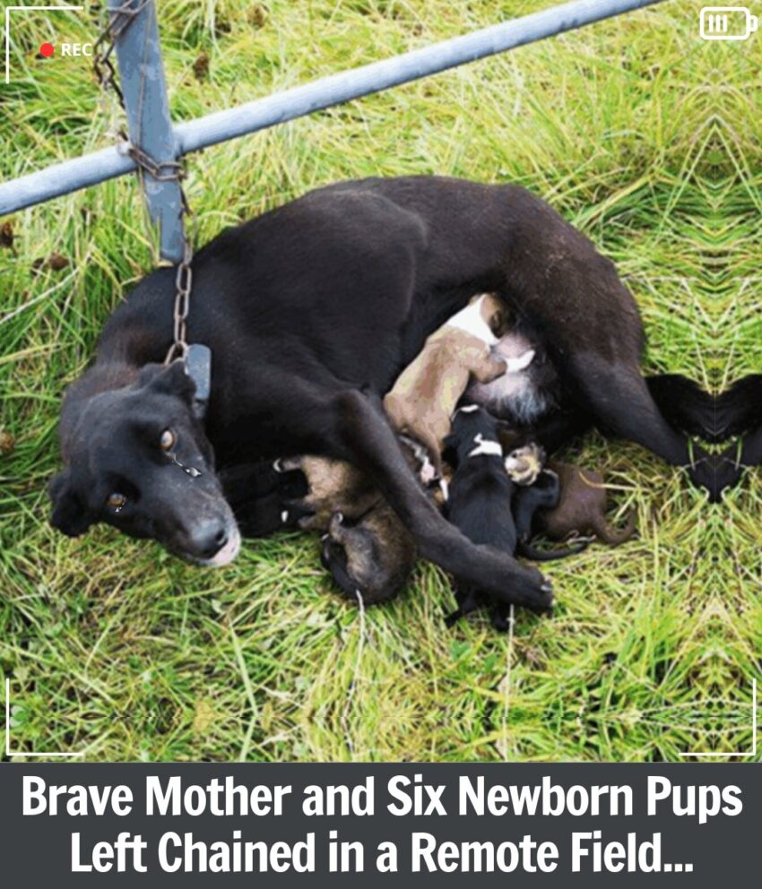 EzoicHer thin body was tightly chained to a cold metal fence post, her freedom stripped away. Just a few feet from her, six tiny newborn puppies—so small their eyes had not yet opened—lay helpless on the ground.