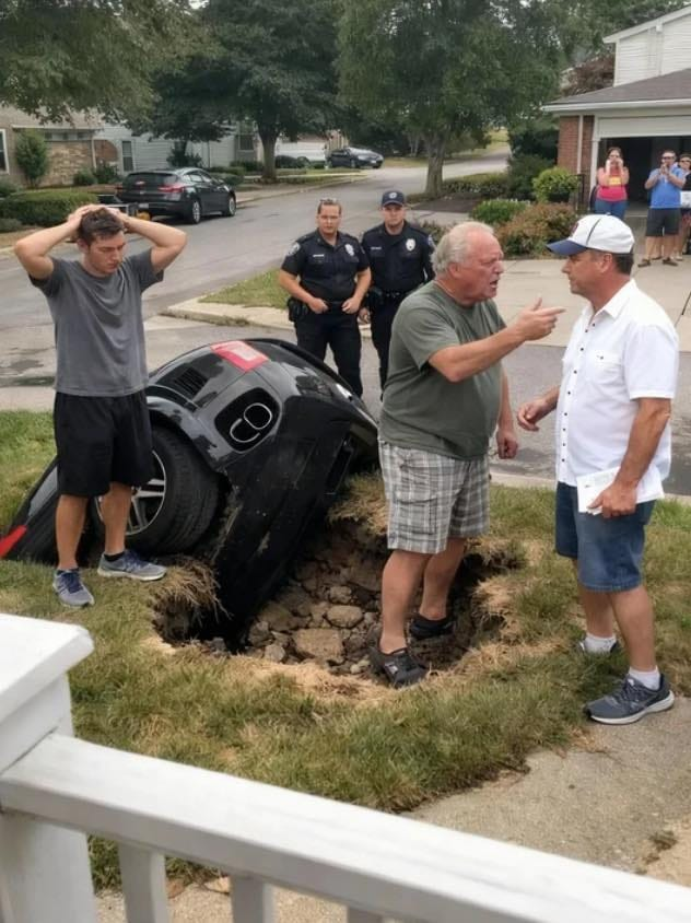 Julian scrambled out, his face flushed, disbelief twisting his expression as he stared at the wreckage—front end buried, frame warped, the illusion of invulnerability shattered as thoroughly as the ground beneath his tires.
