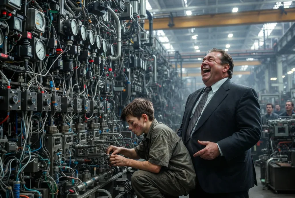La atmósfera en la planta baja era densa, cargada de la desesperación de los técnicos y el miedo de los operarios a perder sus empleos. El olor a aceite quemado se mezclaba con el sudor frío del fracaso. En medio de ese caos de cables expuestos y manuales técnicos esparcidos, apareció Lucas. Era un chiquillo de apenas diez años, con la ropa remendada y las zapatillas rotas, que a veces se colaba por los resquicios de la seguridad de la fábrica, atraído por el zumbido de las máquinas, por el misterio de sus engranajes. Sus ojos, vivaces y curiosos, brillaban con una inteligencia que desmentía su humilde apariencia.