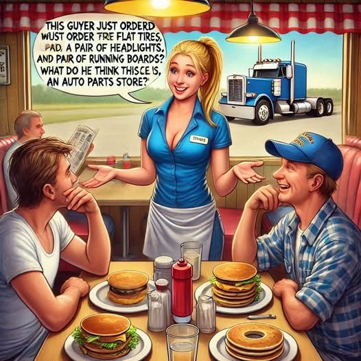 The new blonde waitress, eager to do her job well but puzzled by the request, went to the kitchen and asked the cook, “There’s a guy out there who just ordered three flat tires, a pair of headlights, and a pair of running boards. Does he think this is an auto parts shop?”