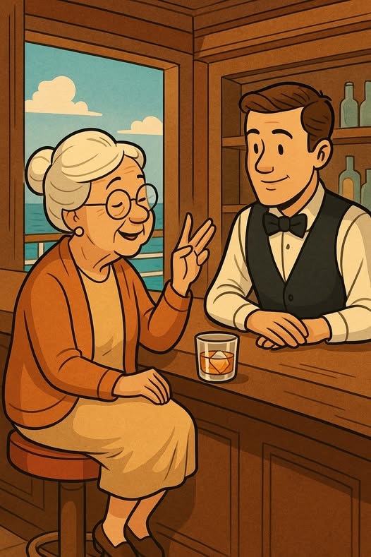 The old woman says. “Thank you. Bartender, I want a Scotch with two drops of water.”