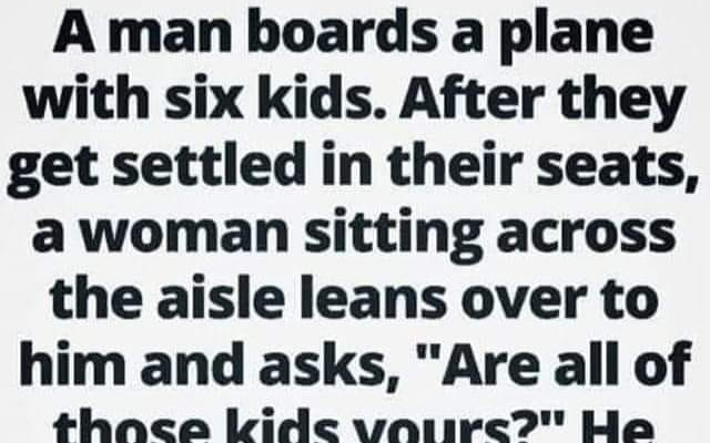 A man boards a plane with six kids. After they get settled in their seats, a woman sitting across the aisle leans over to him and asks