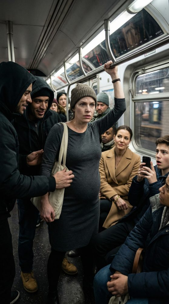I held tight to the subway pole when the train jolted, a sharp pull rolling through my lower belly beneath my plain gray dress. I was eight months pregnant, exhausted, and trying to look invisible—hair tucked under a knit cap, no makeup, cheap sneakers. Just another woman commuting.
