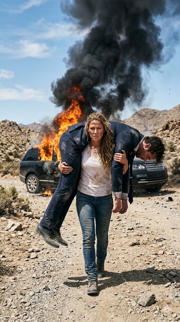 The smoke was suffocating. The man, dressed in a navy suit now soaked with blood, was barely breathing. He was heavy—dead weight—a man in his thirties who would not have survived without her. Moving quickly, Valeria cut the seatbelt with her knife, grabbed him by the shoulders, and dragged him free with a strength she didn’t know she possessed. “You’re not going to die here, not on my watch,” she muttered through clenched teeth as she pulled him across the wet ground, meter by meter away from the burning wreck. They had barely made it fifty meters when the gas tank exploded behind them, sending a wave of heat that forced her to throw herself to the ground, shielding the stranger’s body with her own.
