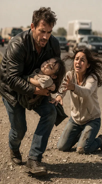Traffic roared past like it always does when it isn’t your problem. Engines growled, horns snapped, and the world kept moving as if a child wasn’t slipping through someone’s arms right there on the roadside.