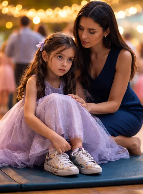 Aria stood with both hands smoothing the front of her lavender dress, her small shoulders squared with a bravery no eight-year-old should have needed. The dress shimmered faintly in the hallway light, soft and beautiful and heartbreakingly delicate. Yet it was her feet that stole my breath.