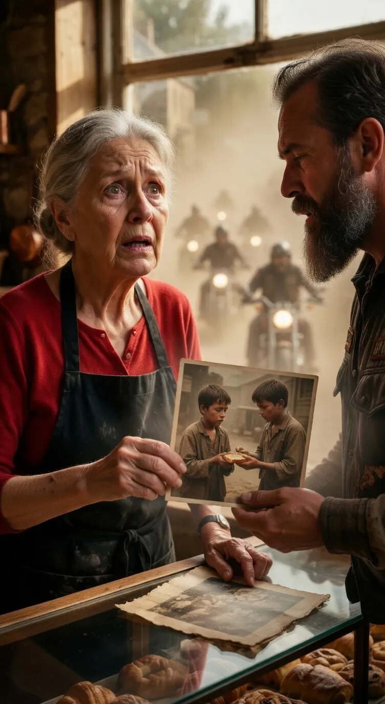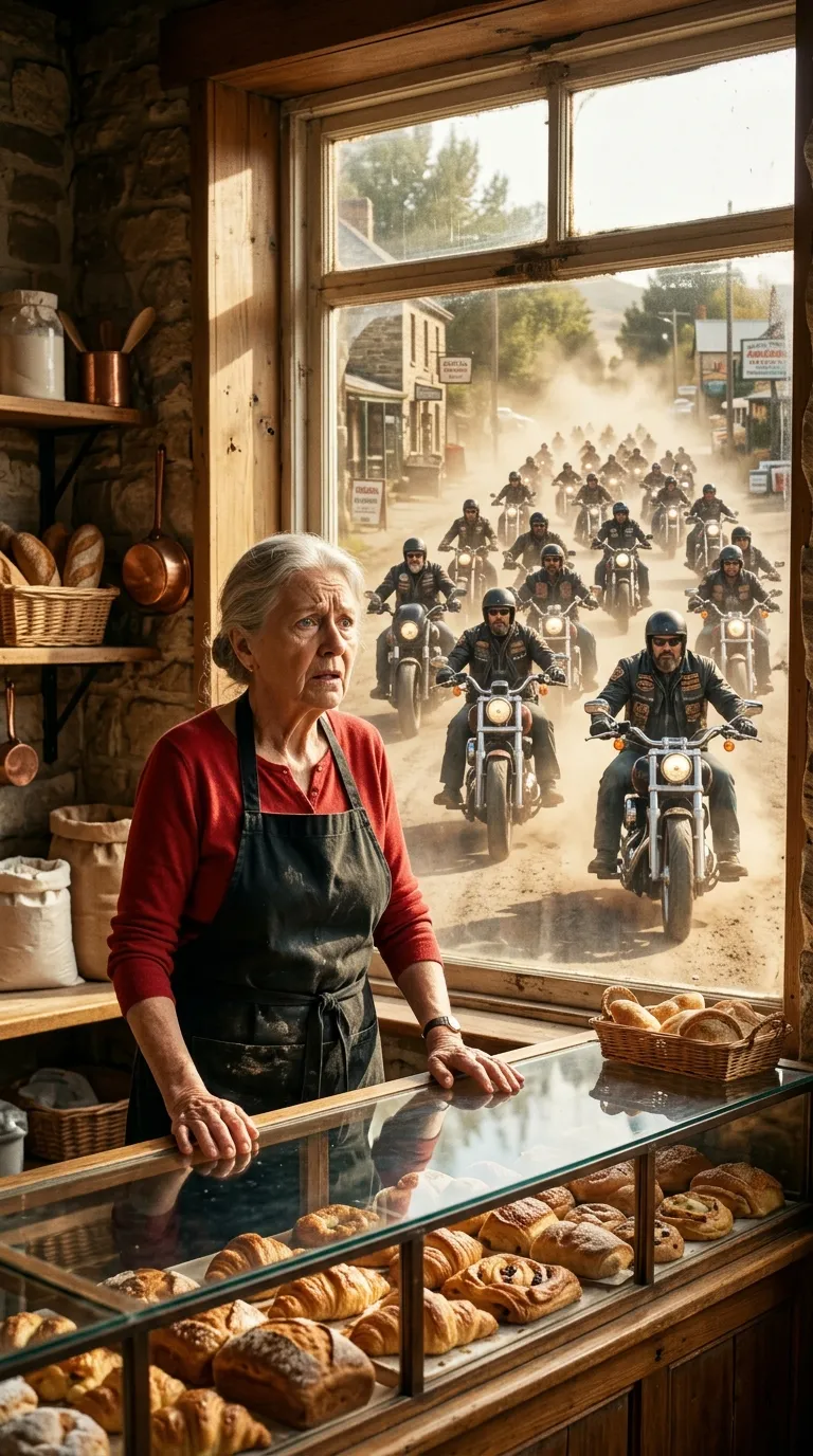 Within seconds, the whole street was lined with them—nearly a hundred bikers, idling in front of her tiny bakery as if they had ridden out of some dark legend and chosen her doorstep for their reckoning.