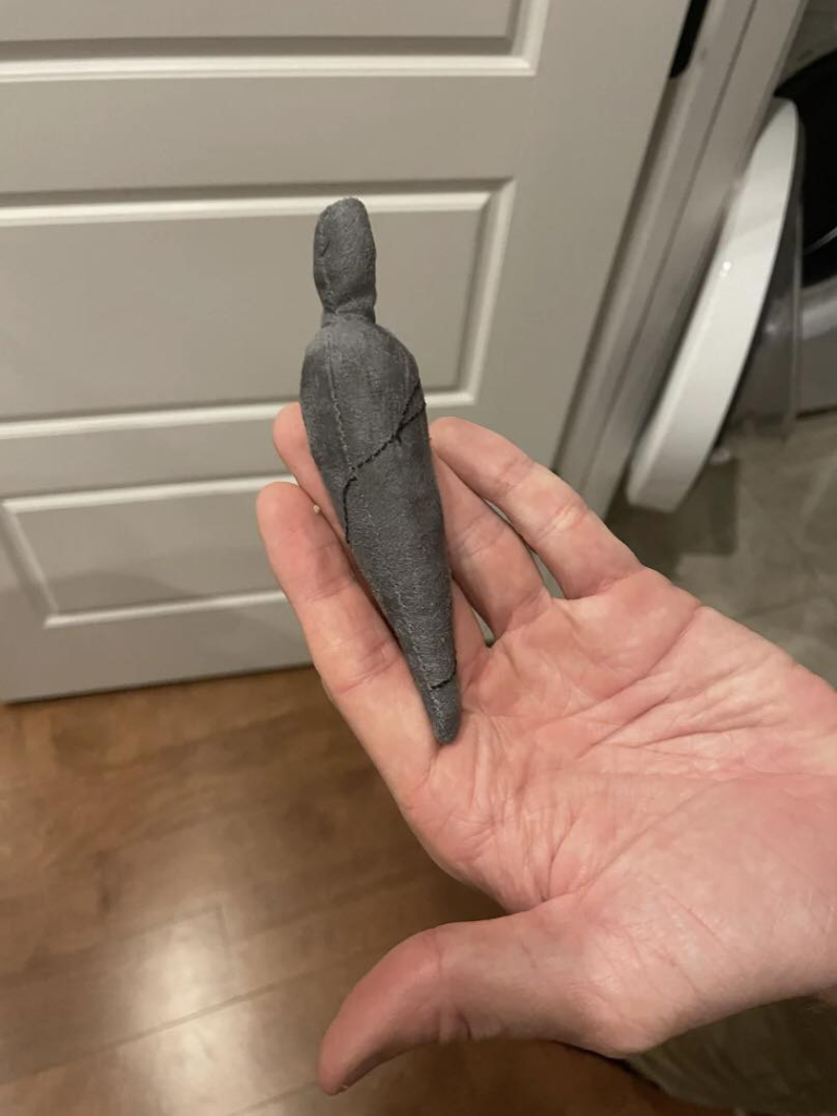 It’s grey, kinda pointy and about the size of a carrot, and weirdly… human shaped? Not like human in a literal sense but had the vague outline of a human wrapped in something shroud like. Honestly it looked like something you’d find buried in the woods on a ghost show. Or the sad prop dept version of a voodoo  doll. Normal stuff right?