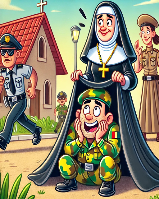 After the 2 MPs ran off, the soldier crawled out from under her skirt and said, “I can’t thank you enough, Sister. You see, I don’t want to go to Iraq…”