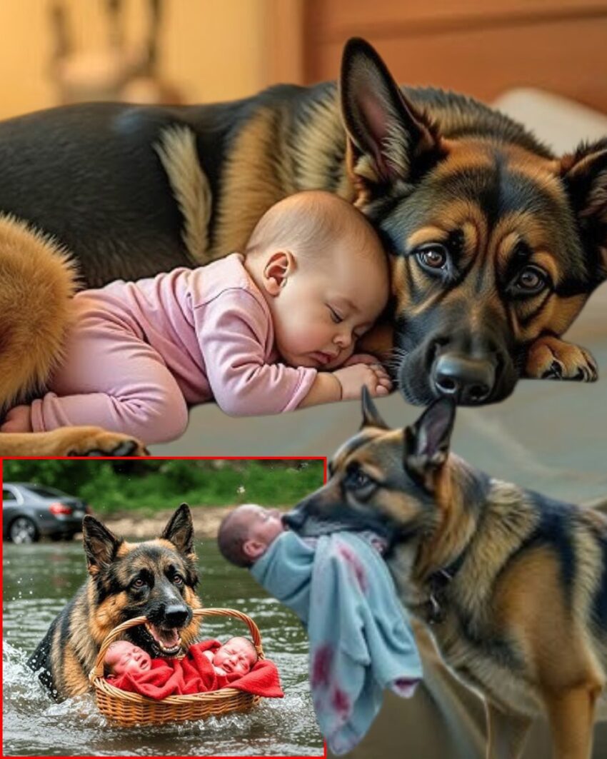 When Blackwood tilted the basket into the icy current below, tossing two infant boys into the merciless spring runoff, Rex’s instinct exploded into action. Before thought could intervene, he hurled himself through the open door and plunged into the torrent. Muscles burning, lungs screaming, the dog chased the sinking basket until he clamped his jaws around its handle. With every ounce of strength bred into his bloodlines, Rex fought upstream to the muddy bank, slippery with morning frost. He hauled the basket onto shore, water dripping from his coat, and pressed his body protectively against it, listening to the babies’ faint, desperate breaths.