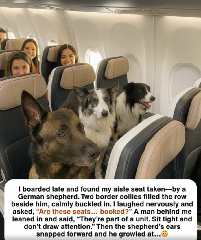 I boarded late and found my aisle seat taken—by a German shepherd. Two border collies filled the row beside him, calmly buckled in. I laughed nervously and asked, “Are these seats… booked?”