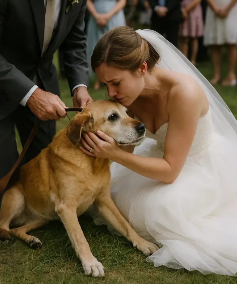 She knelt down slowly, her wedding gown fanning around her like a halo, and held Max’s face in her hands. His soft fur was now tinged with gray, his once bright eyes slightly clouded. But it was his breathing that struck her—shallow, strained, irregular. His legs trembled beneath him.
