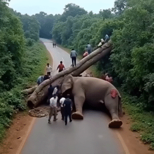 distress when a large tree unexpectedly toppled over itThe scene quickly drew the attention of locals, who rushed to the aid of the gentle giant.