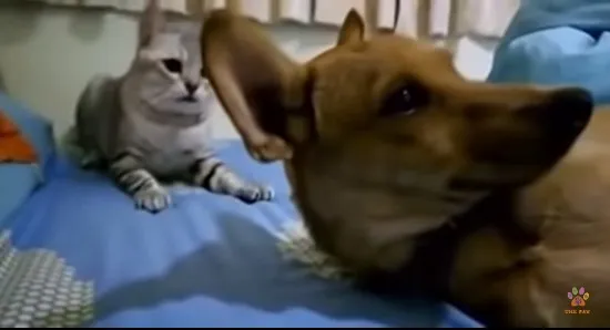 A pet owner is innocently recording his pets. His dog is fast asleep on the bed and beside him, his cat lounges about. All seems fine, until… the unexpected happens.