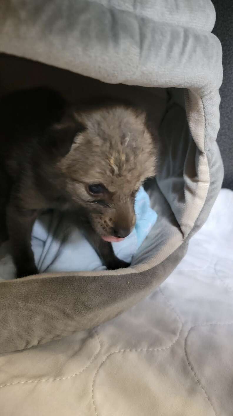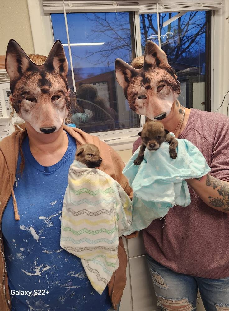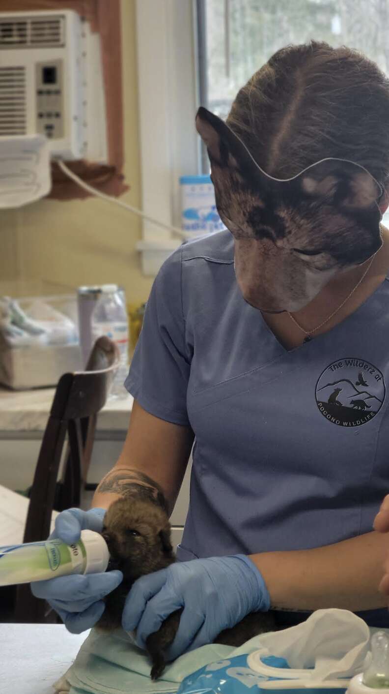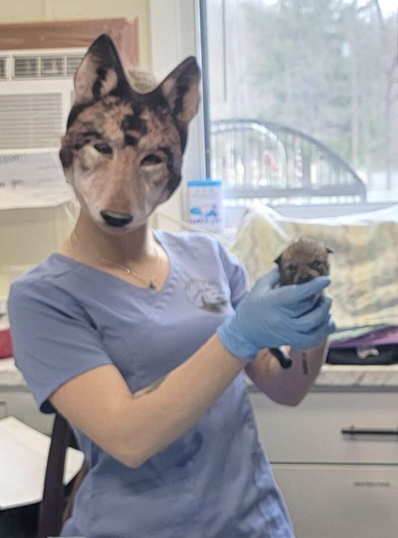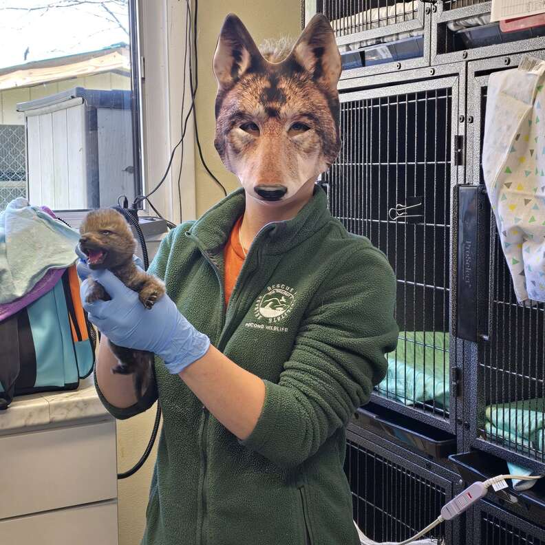 “The masks are necessary for certain species that imprint very easily, like coyotes and eagles,” rehabber Amanda told The Dodo. “Here, we started using the masks once [the coyote pups’] eyes opened, so they do not associate humans with food and care.”