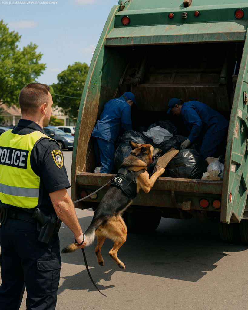 “Hold up!” Hargrave shouted toward the sanitation crew as he jogged forward, the dog straining against him. The workers stopped the truck, puzzled, and one of them, Luis Romero, climbed down from the cab.