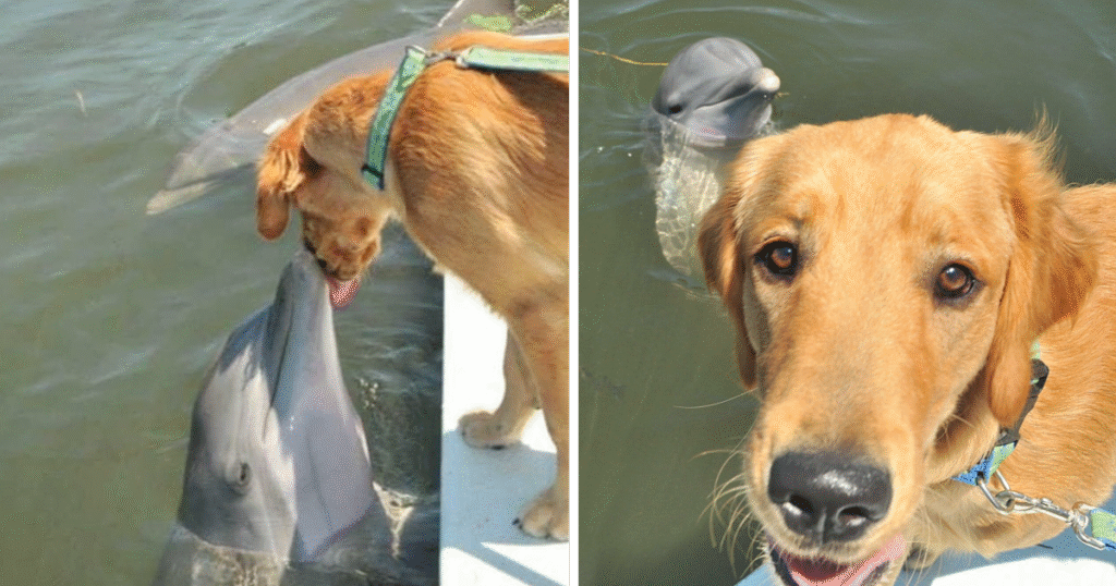 A dolphin eagerly awaits a kiss from his Golden Retriever friend, and their adorable photo has captured hearts, going viral across the internet.