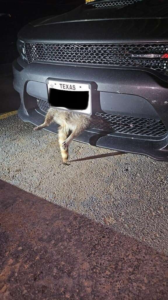 She pulled over and was shocked to find the raccoon’s legs sticking out from behind her front license plate.