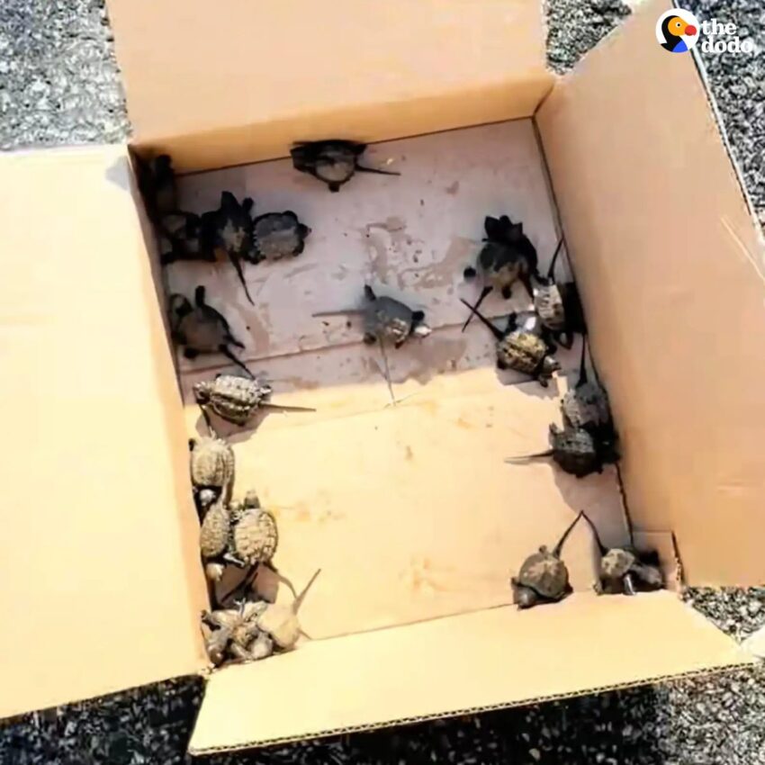 The couple live on the corner of a busy road and often see wildlife who have been hit by cars, and they wanted to make sure that didn’t happen to any of the baby turtles. They gathered them all up as best they could and placed them in a box, then carried the box to a nearby pond to set them free.